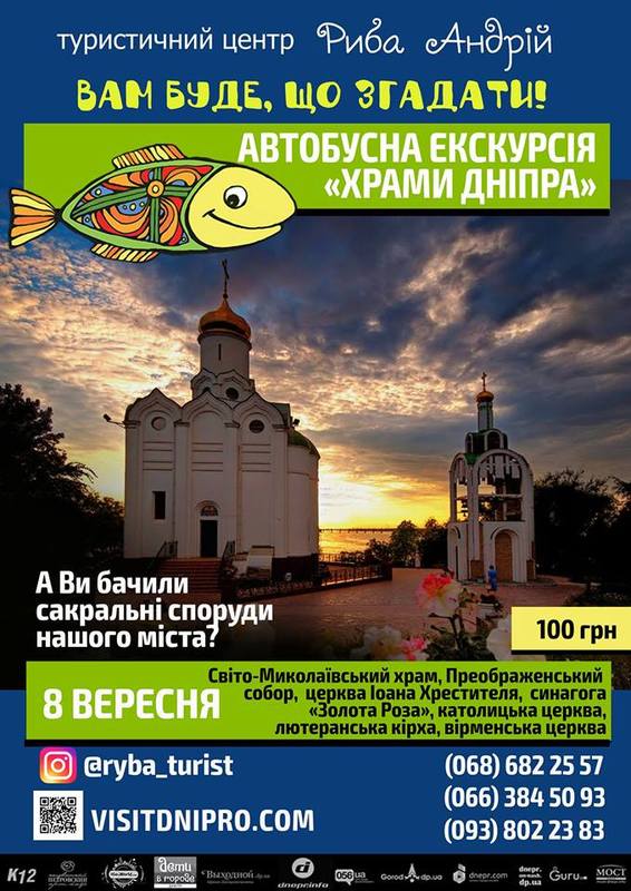 З давніх часів у Катеринославі співіснували представники різних релігій та конфесій: православні та католики, юдеї та мусульмани. Запрошуємо на автобусну екскурсію «Храми Дніпра», під час якої ми познайомимось із релігійною історією нашого міста! Спробуємо розгадати таємниці Преображенського Собору, перший камінь якого заклала особисто імператриця Катерина ІІ. Побуваємо на загадковому Монастирському острові та дізнаємось, який храм знаходився там у давні часи. Завітаємо до єдиного у місті католицького костелу, відвідаємо лютеранську кірху та вірменську церкву. А ще, дізнаємось історію хоральної синагоги «Золота Троянда», збудованої у далекому 1852 році.