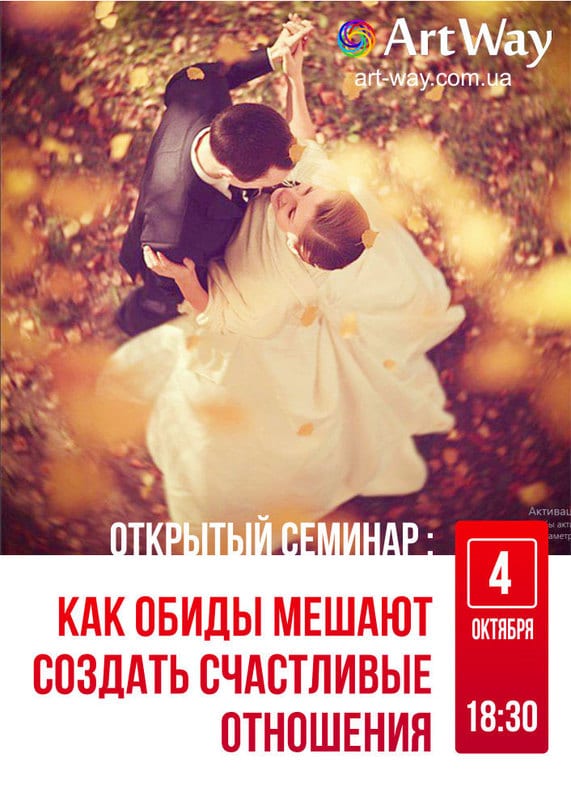 Мастерская целостного развития личности ArtWay приглашает Вас 4 октября в 18.30 на ОТКРЫТЫЙ практический семинар “Как обиды мешают создать счастливые отношения”