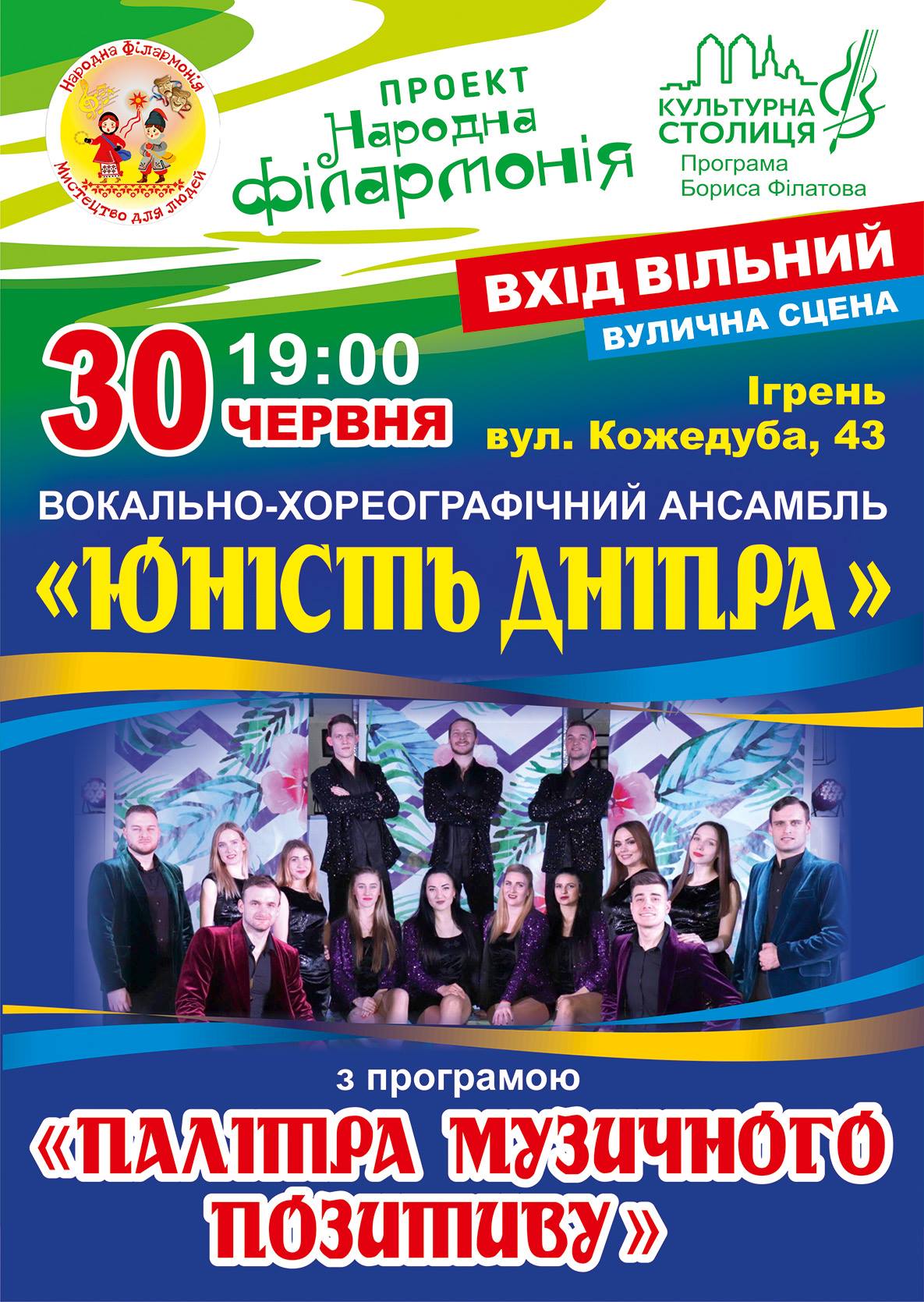 30 червня о 19-00 на ж/м Ігрень (вул. Кожедуба,43, вулична сцена) – концертна програма вокально-хореографічного ансамблю «Юність Дніпра» «Палітра музичного позитиву». Захід відбувається в рамках проекту «Народна філармонія» програми Бориса Філатова « Культурна столиця» Вхід вільний.