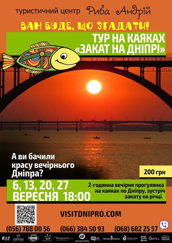 Риба Турист знайшов ідеальний засіб для зняття стресу після робочого дня! Це – прогулянка на каяках по Дніпру. Тільки уявіть: перша вечірня прохолода, легкий вітерець, незвичні ракурси рідного міста та неповторні пейзажі…Усе це чекає на Вас під час 2-годинної річкової прогулянки. А найголовніше – ви зустрінете захід Сонця на воді!